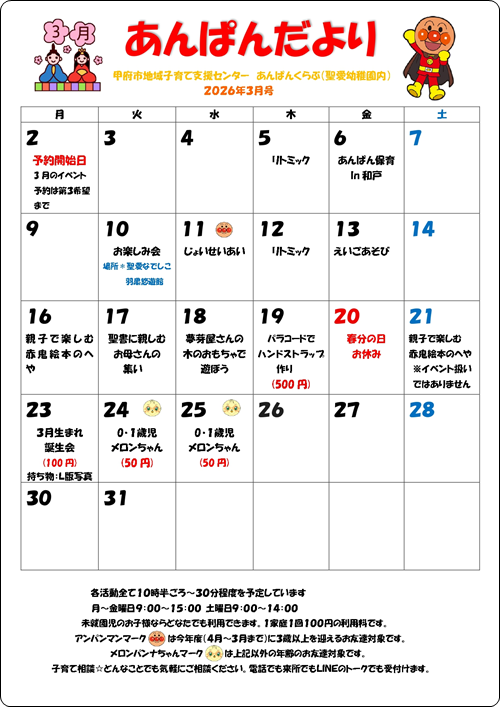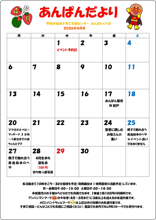 イベントの予約は各月の1日(土日の場合は翌月曜日) 9:00〜12:00。